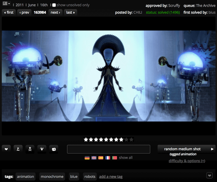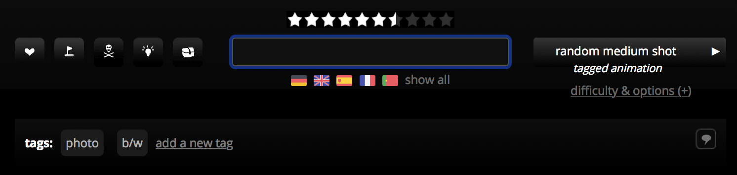You are given an image taken from a movie scene and you have to guess the movie’s title. The flags mean you don’t have to enter the original title to get points — you can also write it in German, French, Spanish etc. We support a lot of languages for alternative titles to let users from all around the world the possibility to play and compete with the rest of the users.